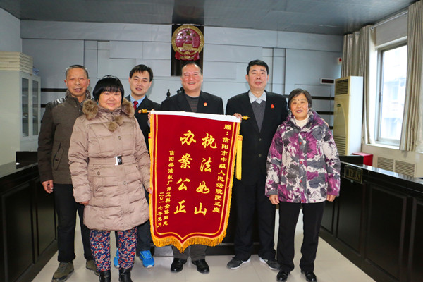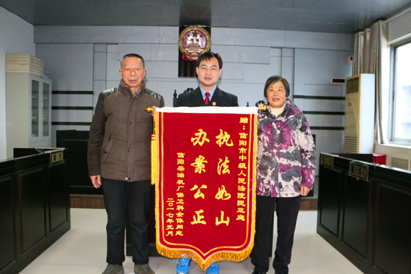 1月11日,原信阳柴油机厂保卫科职工代表为民三庭送来锦旗,交口称赞法官办案公正,执法如山。