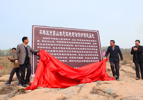 草长莺飞,杨柳春烟,万物萌苏之时,山峦绵延、苍松翠柏的天目山春意盎然,使人神清气爽、心旷神怡。3月29日上午,平桥区天目山生态环境司法保护示范基地在国有天目山林场陈大沟林区正式揭牌成立。信阳市中级人民法院党组副书记、副院长冯琦,平桥区副区长黄家新,信阳市中级人民法院环境资源审判庭庭长蔡红莉,平桥区林业局局长曾凡春及天目山林场、邢集乡政府等有关单位负责人出席了揭牌仪式,平桥区法院代院长马萍主持揭牌仪式。