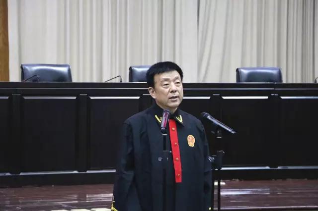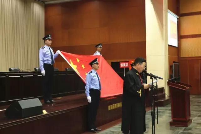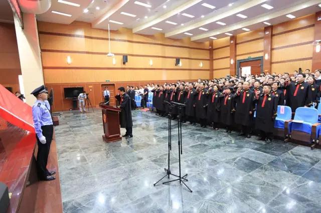 伴随着雄壮的国歌声,面对鲜艳的五星红旗和庄严的国徽,在谢天学、詹玉锋和人大代表、政协委员、廉政监督员的监誓下,在张新中的领誓下,71名员额法官身着法袍,高举右手,庄严宣誓:“忠于中华人民共和国宪法,维护宪法权威,履行法定职责,忠于祖国、忠于人民,恪尽职守、廉洁奉公,接受人民监督,为建设富强、民主、文明、和谐的社会主义国家努力奋斗!”