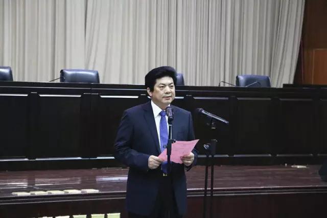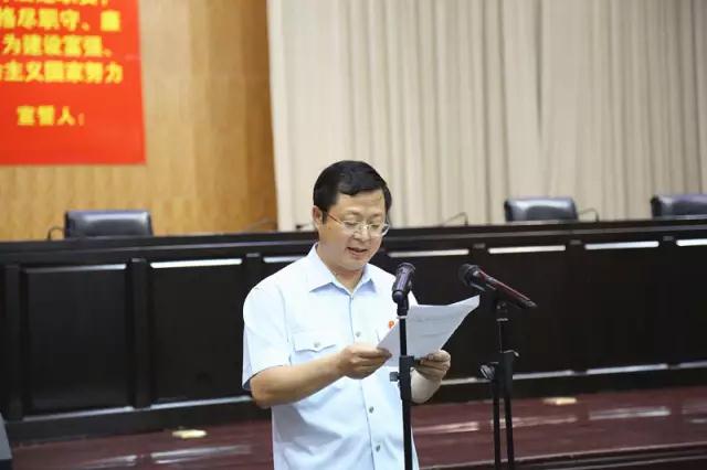 信阳中院党组成员、政治部主任奚启锋宣读了《河南省高级人民法院关于批准信阳市两级法院首批法官入额的决定》和信阳市人大常委会《关于任命周启明等职务的通知》。