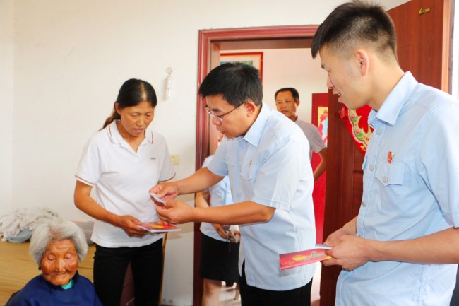 6月29日上午,信阳中院党组成员、副院长翟陆带领民一庭干警一行来到商城县苏仙石乡秦河村慰问105岁高龄的红军失散人员何守荣同志,向她表示亲切的慰问和诚挚的祝福,并赠送了信阳市中级人民法院涉军维权联系卡和《军人军属维权手册》。