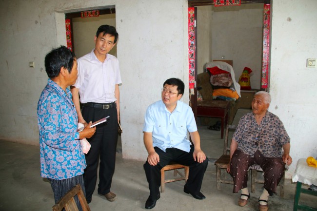 奚启锋一行首先来到商城县观庙镇南洼村,看望已经100岁高龄的退伍老红军童庆安。奚启锋细心询问了老人的身体状况,并为其家属发放了军人军属维权手册和涉军维权联系卡,嘱咐其家属及相关部门人员一定要解决好老战士的实际困难,让他们老有所依、安享晚年。