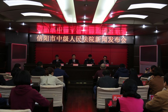 4月25日上午,信阳市中级人民法院与河南省高级人民法院同步召开失信联合惩戒暨集中曝光失信人新闻发布会。信阳中院党组副书记、常务副院长王玉明、中院法警支队支队长、执行局负责人李忠智、中院执行局副局长付晓虎及中院各部门相关人员参加新闻发布会。中院政治部副主任、新闻发言人金波主持发布会。河南法制报、河南经济报、大河报、映象网、信阳日报、信阳晚报、信阳电视台等省、市级媒体应邀参加发布会。
