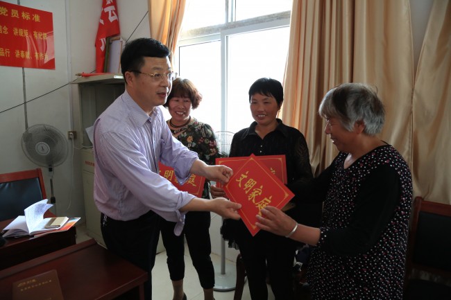 古语云:“家之兴替,在于礼仪,不在于富贵贫贱”。为大力弘扬社会主义核心价值观和中华民族家和邻睦传统美德,加强帮扶村精神文明建设,5月15日上午,中院党组成员、政治部主任奚启锋、机关党委副书记徐贵瑛、政治部支部书记、工会副主席简春红等一行赴帮扶联系点息县岗李店乡宋庄村,参与该村举办文明创建活动,为评选出文明创建活动中的3户优秀家庭代表颁发“文明家庭”奖,代表中院政治部支部捐赠孝善基金募集捐款,并与该村两委班子就扶贫工作开展座谈。
